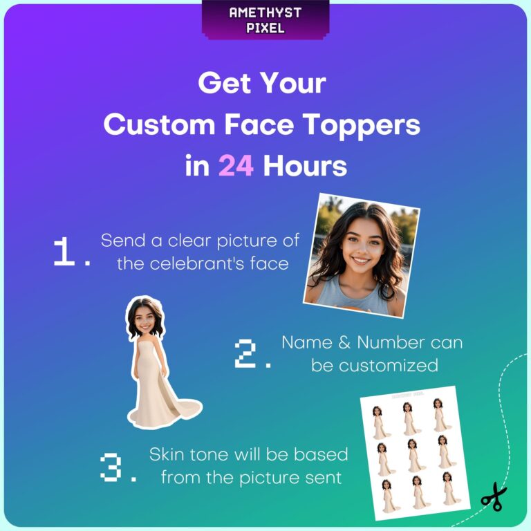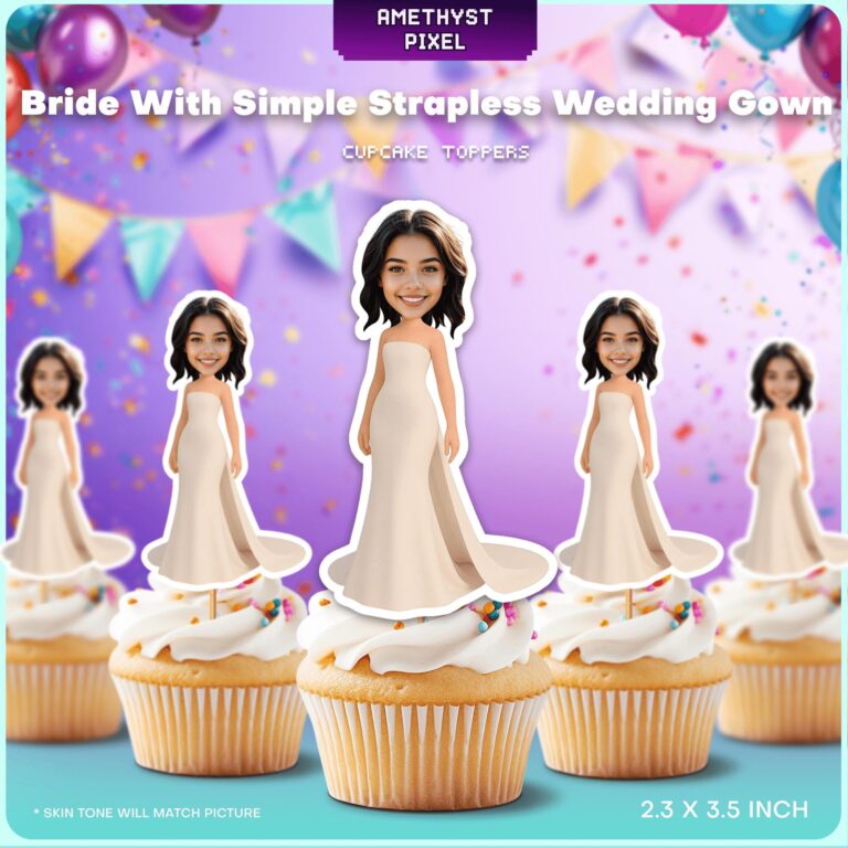 Celebrate the bride-to-be with these sophisticated custom face cupcake toppers, featuring a stunning illustration of a bride wearing a timeless, simple strapless wedding gown. Perfect for adults planning a bridal shower, bachelorette party, or engagement celebration, these printable decorations add a personal and humorous touch to your dessert table. The design highlights a sleek, floor-length white dress with a clean neckline, offering a modern and chic aesthetic that complements various party themes. We professionally edit the head onto the body, ensuring the skin tone matches your provided photo for a high-quality finish. These DIY cutouts serve not only as cake picks but also as memorable photo props that honor the special woman of the hour.