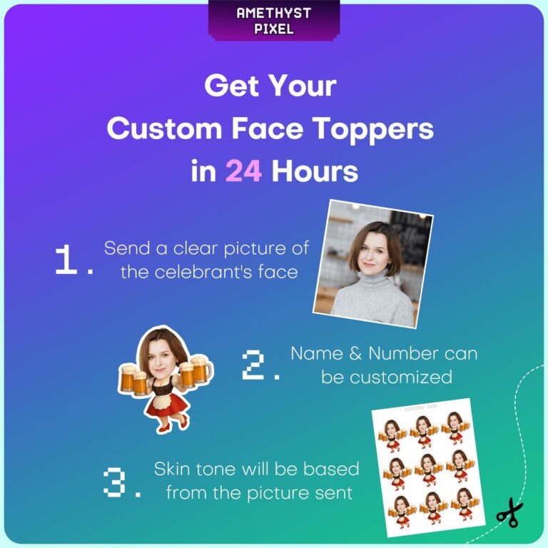 Elevate the atmosphere of your next Oktoberfest celebration or adult birthday bash with these spirited Beer Maid cupcake toppers featuring the guest of honor's face. The vibrant design depicts a cheerful Bavarian barmaid character dressed in a traditional red and brown dirndl, expertly carrying four large, frothy beer mugs. Ideal for adults celebrating a 21st birthday, a bachelorette party, or a local brew fest, these personalized photo decorations bring distinct humor and festivity to your dessert spread. Each topper is crafted to highlight the face you provide, creating a hilarious and memorable centerpiece for any beer-themed event or tavern gathering.