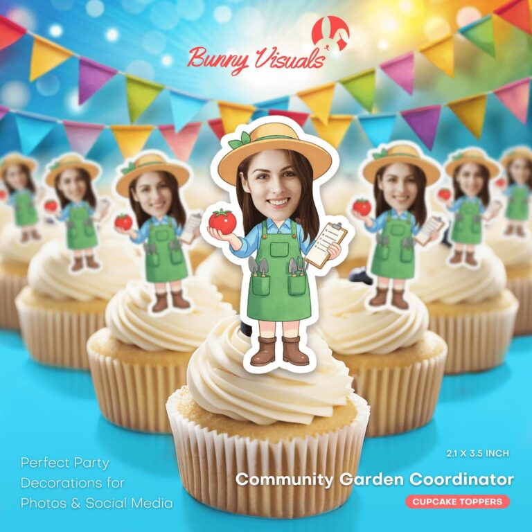 Elevate your horticultural celebration with these professionally crafted custom face cupcake toppers, featuring a detailed 'Community Garden Coordinator' design perfect for honoring the devoted grower in your life. The illustration showcases a character dressed in practical gardening attire, including a sturdy green apron filled with hand tools, sensible brown boots, and a wide-brimmed sun hat. The figure proudly displays a ripe red tomato while managing a clipboard, capturing the essence of a busy, organized agriculturist. Whether you are planning a retirement bash for a landscape professional, a harvest season gathering, or a birthday for a plant lover, these personalized printable decorations add a touch of humor and recognition. By incorporating a photo of the guest of honor, you create a memorable focal point that resonates with friends, family, and fellow community members who appreciate the hard work of cultivating nature.