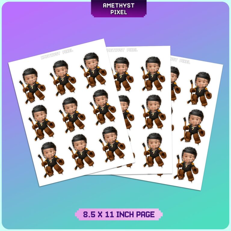 Transform your dessert table into center ice with these dynamic ice hockey cupcake toppers, designed to feature your child's smiling face as the star player. The illustration depicts a fully geared athlete wearing a black helmet with a protective cage, a black and yellow jersey with the number 7, and detailed brown goalie pads while gripping a hockey stick. Perfect for toddlers and young children, these 2.2 x 3.2-inch decorations add a high-energy, personalized touch to any sports-themed event. Whether you are hosting a "Rookie of the Year" first birthday or celebrating a play-off victory, these custom face toppers provide a professional and spirited look that resonates with hockey families and fans alike.