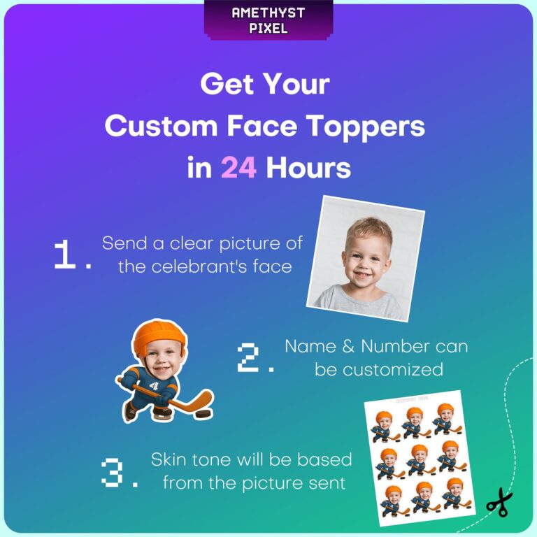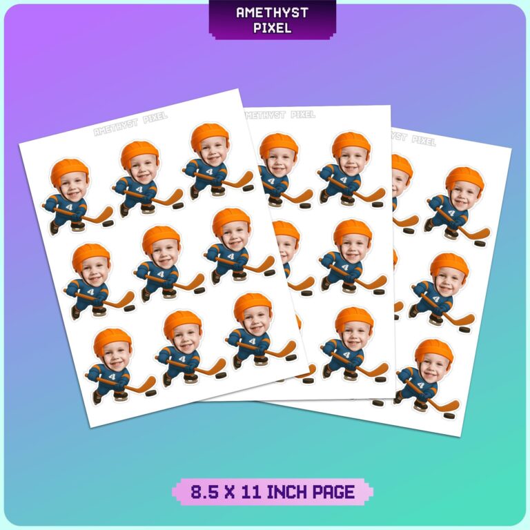 Transform your dessert table into a championship celebration with these personalized ice hockey cupcake toppers. Designed specifically for young sports enthusiasts, each topper features your child’s smiling face imposed onto an action-packed cartoon hockey player detailed with a blue jersey, orange helmet, and hockey stick ready for the face-off. Whether you are hosting a winter sports birthday bash or celebrating a team victory after a big game, these custom decorations serve as the perfect centerpiece for cupcakes and muffins. The high-quality digital design ensures that the unique facial features of your little MVP blend naturally with the illustration, creating a fun and memorable focal point. These DIY printable toppers are ideal for parents looking to add a professional, spirited touch to home-baked treats without the need for expensive custom bakeries.