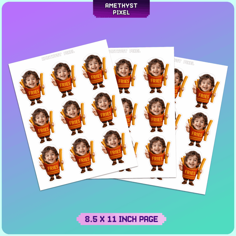 Order up a side of fun for your next celebration with these personalized French Fries Buddy cupcake toppers. Perfect for a "Small Fry" first birthday or any fast food-themed bash, this design features your child's face superimposed onto a cheerful red fry carton body. The character playfully holds up a golden french fry in one hand while making a peace sign with the other, adding a humorous and spirited touch to the dessert table. This is a digital download file that puts you in control of the printing process, allowing you to create as many custom toppers as you need right from home. We carefully edit your provided photo to ensure the skin tone blends naturally with the cartoon body for a seamless, professional look. Whether you are celebrating a toddler who loves snacks or planning a creative burger-bash, these funny photo-based decorations are sure to get guests smiling.
