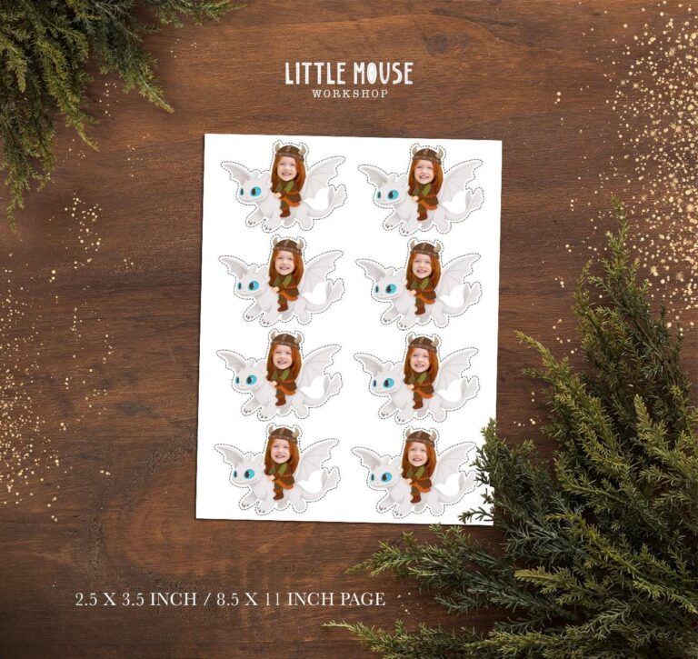 Transform your little one into a legendary dragon rider with these professionally designed Light Fury cupcake toppers, perfect for an immersive dragon-themed birthday celebration. Featuring the sleek white dragon characters famously loved by children, this downloadable party décor places your child's face directly into the action, wearing authentic Viking leather armor and a classic horned helmet. We go beyond simple cut-outs by adjusting the character's skin tone to match your uploaded photo, ensuring a seamless and high-quality finish. Sized at approximately 2.5 x 3.5 inches and arranged on a standard 8.5 x 11-inch printable sheet, these toppers provide an expert touch to home-baked or store-bought treats, making them an ideal choice for parents seeking unique, memorable party details for girls or boys who dream of the Isle of Berk.