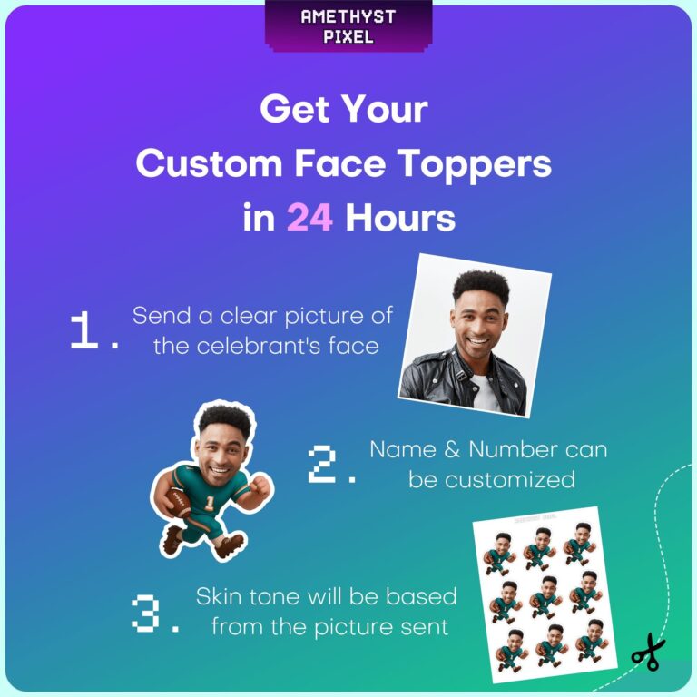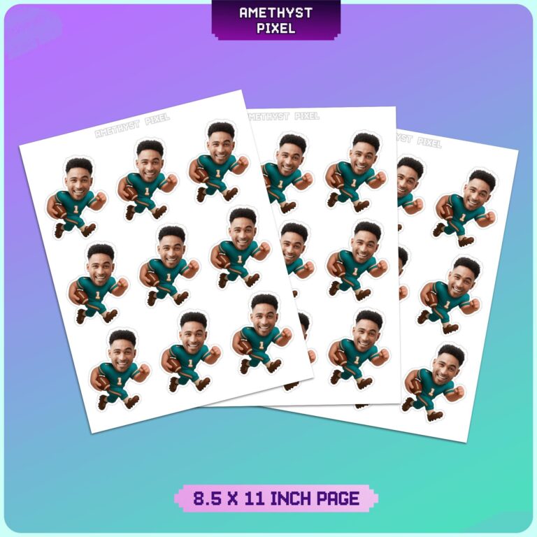 Score a touchdown at your next event with these spirited Miami football cupcake toppers, designed to celebrate the iconic teal and orange team colors. Each topper features a high-energy cartoon body of a football player sprinting with the ball, ready to be personalized with the face of your guest of honor. Ideal for adult viewing parties, teen birthdays, or dedicated sports fans, these 2.6 x 3.5-inch printable decorations bring humor and team spirit to any dessert spread. The high-resolution design ensures that the vibrant aqua jersey and orange detailing pop against white frosting, making them a standout addition to game day snacks or celebratory cakes. Whether for a fantasy league draft or a milestone birthday, these custom face cutouts provide a professional, fun, and memorable way to highlight the biggest fan in the room.