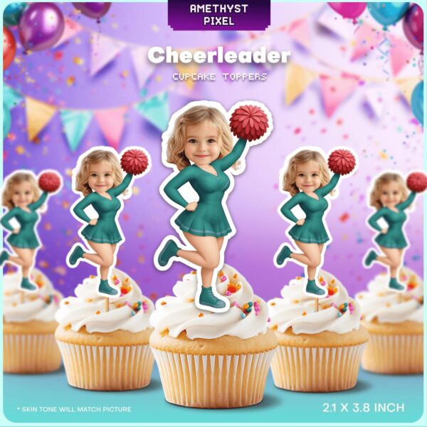 Personalized Cheerleader Theme Cupcake Toppers with Custom Face and Teal Uniform