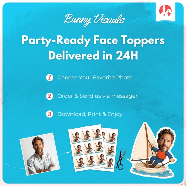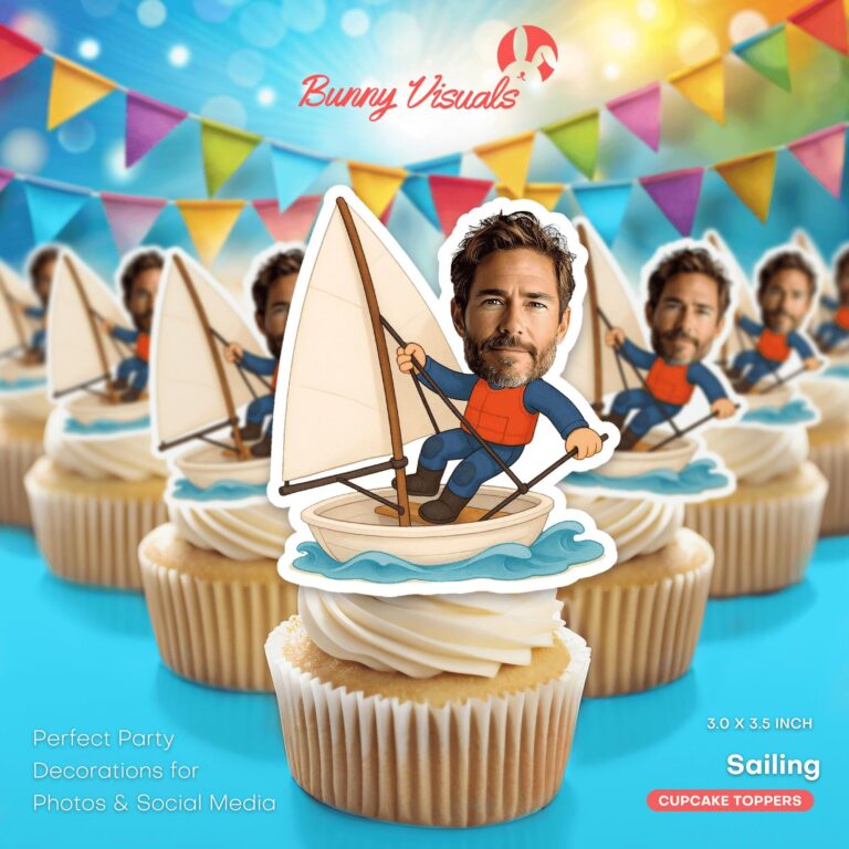 Celebrate the captain of your crew with these custom photo sailing cupcake toppers, designed specifically to bring a splash of humor and personalization to nautical-themed events. Ideal for an adult male’s birthday or a heartfelt retirement send-off, the design features a spirited cartoon body piloting a sailboat through crashing waves while wearing a safety orange life vest. By incorporating the guest of honor's real face onto this adventurous sailor, you create an instant focal point for your dessert spread that resonates with boating enthusiasts and ocean lovers alike. These high-resolution printable decorations offer a clever, trustworthy way to enhance party photos and social media shares, ensuring your "bon voyage" or birthday bash is memorable and professionally styled.