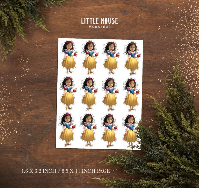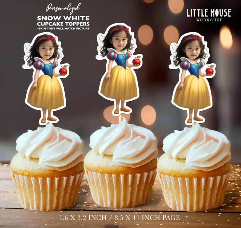 Transform your little girl into the fairest of them all with these expertly designed Snow White themed cupcake toppers. This digital printable places your child's distinct photo onto a beautifully illustrated body wearing the iconic blue bodice, puffed sleeves, and flowing yellow skirt associated with the classic fairytale princess. In this charming design, the character is depicted holding a bright red apple, adding an authentic storybook detail that delights guests and honors the beloved narrative. Ideal for birthday celebrations for toddlers and young children, these personalized decorations serve as a high-quality focal point for your dessert table. The file is optimized for standard 8.5 x 11 inch paper, allowing for crisp, vibrant printing at home. Parents seeking a seamless blend of professional design and DIY convenience will find these custom face toppers to be the perfect magical finishing touch.