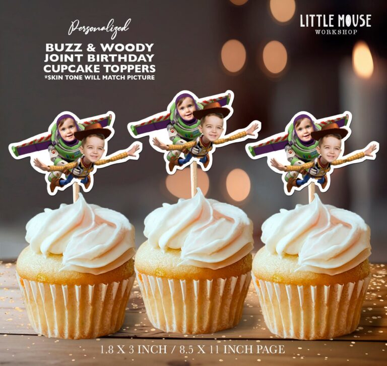Celebrating two special milestones at once requires a theme that emphasizes teamwork and adventure, and these custom photo joint birthday cupcake toppers deliver exactly that by transforming your little ones into the ultimate space ranger and cowboy team. Ideal for brothers, cousins, or best friends sharing a celebration, this dynamic design features two distinct uploaded faces superimposed onto the action-packed bodies of Buzz and Woody mid-flight. The composition captures the Space Ranger deploying his wings while the faithful Sheriff rides along, symbolizing a shared journey that is perfect for a "Two Infinity and Beyond" toddler bash or a classic toy-themed event. Sized at approximately 1.8 by 3 inches, these printable decorations add a humorous and heartwarming personalized touch to your dessert table, ensuring both guests of honor feel equally celebrated.