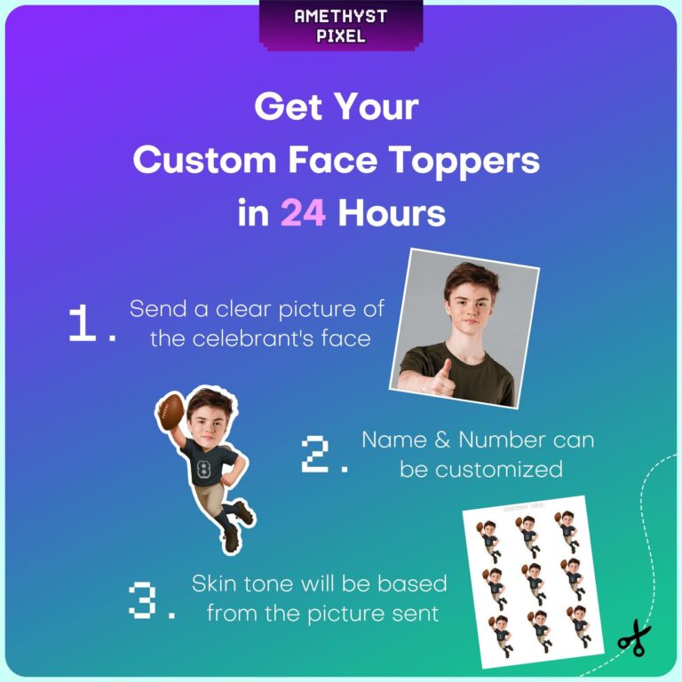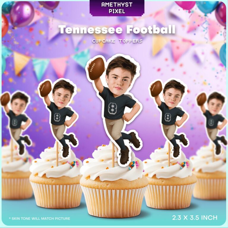Score a touchdown at your next event with these high-energy custom face cupcake toppers, perfectly styled for a Tennessee football-themed birthday celebration. Featuring a detailed illustration of an athlete in a navy blue jersey and tan pants leaping with a football, these decorations are designed to highlight the birthday boy’s face in a fun, action-packed pose. Ideal for children and pre-teens who love the gridiron, these 2.3 x 3.5-inch toppers transform ordinary cupcakes into personalized fan favorites. Whether you are organizing a youth team banquet or a spirited tailgate party, these professionally crafted cutouts add a unique layer of excitement and personalization that honors the guest of honor’s passion for the sport.