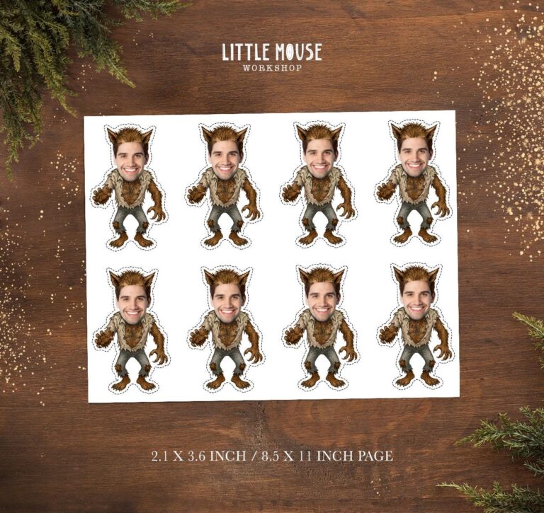 Transform the guest of honor into a legendary creature of the night with these expertly designed custom face Wolf Man cupcake toppers. Ideal for adult costume parties, teen horror movie nights, or October birthdays, this personalized decoration captures the classic werewolf aesthetic with textured brown fur, claws, and tattered clothing. By superimposing a clear photo of your friend or family member onto the cartoon body, you create a humorous and commanding focal point for your dessert table. These high-resolution printable designs are laid out on standard 8.5 x 11-inch letter paper, resulting in sturdy toppers measuring approximately 2.1 x 3.6 inches—perfect for ensuring your custom decor stands out on cupcakes, muffins, or savory party appetizers.