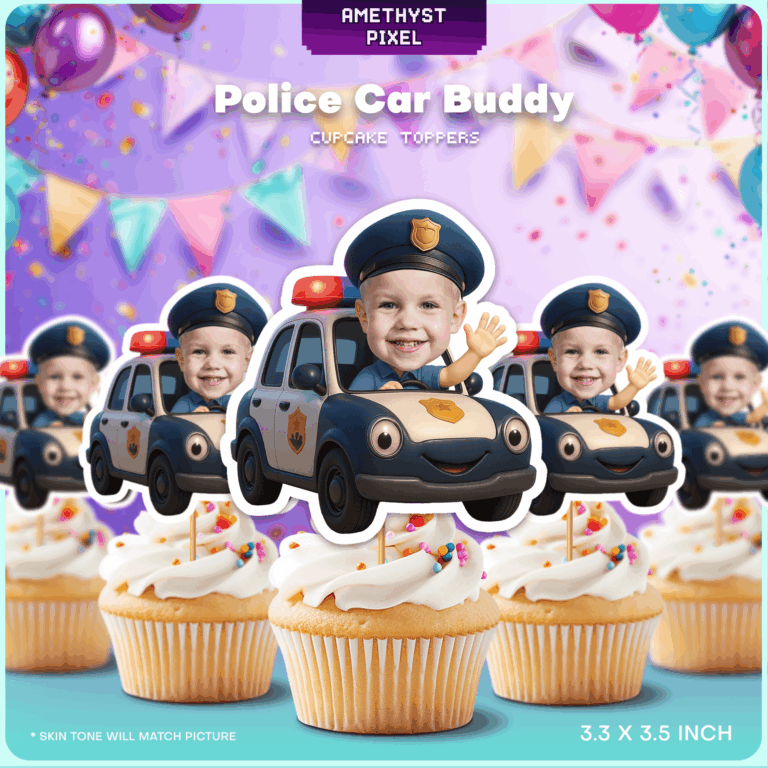 Custom Police Car Cupcake Toppers with Face – Personalized Officer Printable Birthday Decor