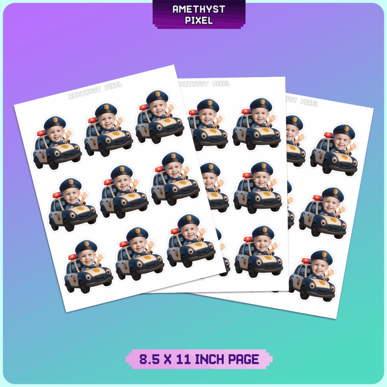 Make your little officer the chief of the celebration with these adorable custom police car cupcake toppers. Ideally suited for toddlers and young children who are fascinated by rescue vehicles and sirens, this design features a friendly, cartoon-style blue police cruiser with a smiling bumper. Your child's face is seamlessly integrated into the driver's seat, complete with a digital police cap and uniform body that appears to be waving to party guests. This digital file offers a fun, high-quality way to personalize a law enforcement or vehicle-themed birthday without waiting for shipping. The bright colors and playful design ensure the photos pop when printed, creating a memorable addition to your dessert table.