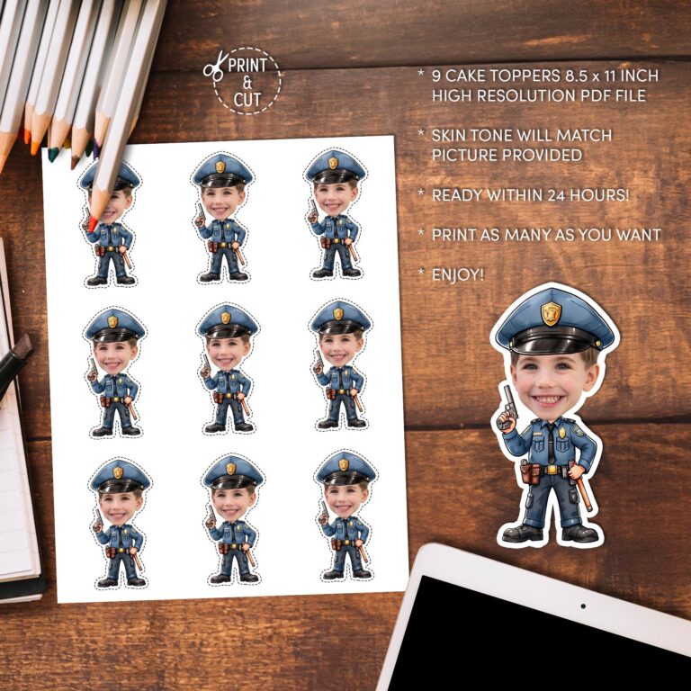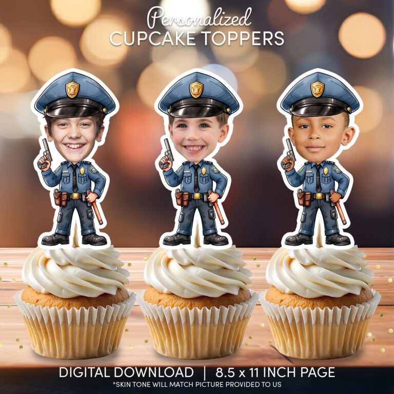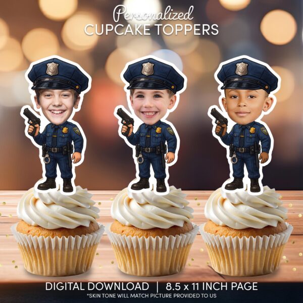 Celebrate your little recruit’s distinct personality with these personalized police officer cupcake toppers. This digital download transforms your child's photo into a courageous cartoon cop, featuring a classic blue uniform, peaked cap, badge, and duty belt accessories. Perfect for toddlers and young boys who dream of joining the force, these custom decorations instantly tie together a law enforcement or "police academy" theme. The design includes professional skin tone matching based on the photo you provide, ensuring the character looks natural and integrated. After downloading, you can easily print on heavy cardstock and cut them out at home for a high-quality finish on your dessert table.