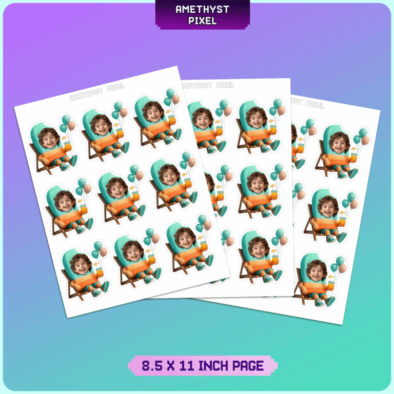 Cool down your next summer celebration with these hilarious custom popsicle face cupcake toppers. This digital design transforms the birthday boy or girl into a relaxed "Popsicle Buddy," featuring a teal and orange ice pop body lounging in a wooden beach chair. The character is detailed with a refreshing tropical drink in hand and a festive bunch of balloons, capturing the perfect chill vibe for warm-weather events. Ideally suited for toddlers and young children celebrating summer birthdays, these printable decorations add a splash of humor and personalization to any dessert table. As a digital download, you receive a high-resolution file ready for printing at home, allowing you to create memorable, professional-looking party decor with ease.