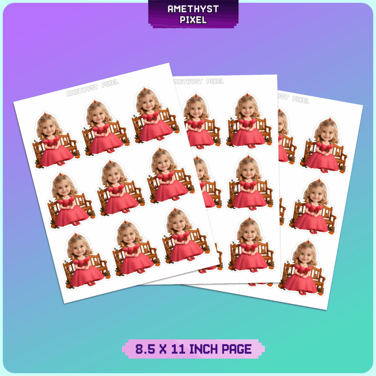 Transform your little one into royalty with these charming custom face princess cupcake toppers. Designed primarily for toddlers and young girls, this printable party decoration features a delightful illustration of a princess in a pink ballgown, seated on a wooden bench with sweet birds and a red rose, all topped with your child's smiling face. Ideal for fairytale-themed birthday celebrations or royal tea parties, these digital downloads provide a high-quality, personalized touch to your dessert table. Simply upload a clear photo to get started, print on sturdy cardstock for the best finish, and create memorable photo props that guests will adore. The design includes intricate details like a golden tiara, ensuring a truly magical look for your event.