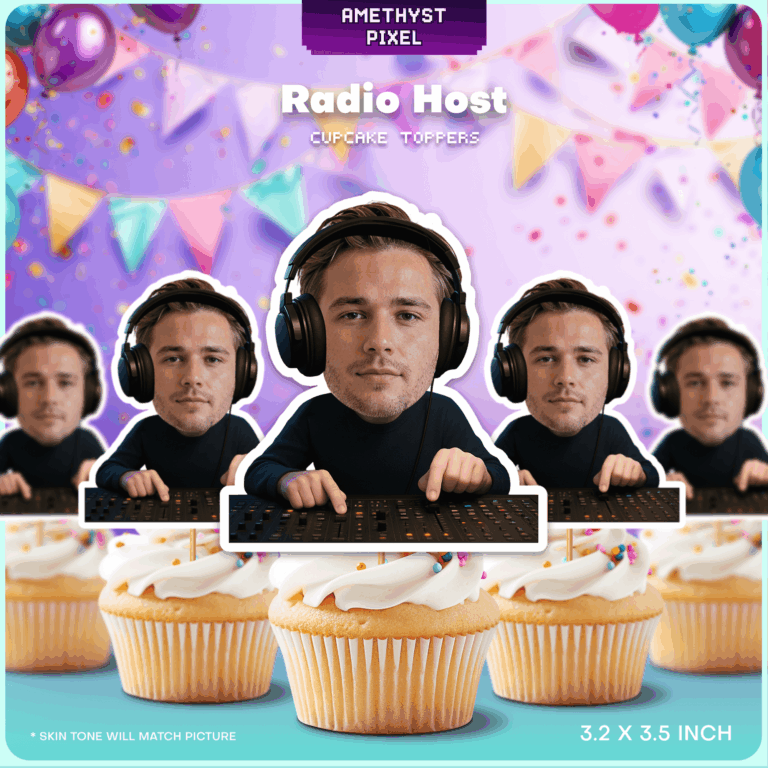 Turn up the volume at your next event with these custom radio host cupcake toppers, perfect for celebrating the voice behind the microphone. Whether you are planning a birthday for an aspiring DJ, a podcast launch party, or a retirement celebration for a career broadcaster, these digital decorations add a personal and professional touch. The design features a detailed body manipulating a sound mixing console while wearing large studio headphones, ready for your guest of honor's face to be added. Best suited for adults and teens with a passion for audio, music, or media, these printable files are designed for easy home assembly. Simply provide a high-quality photo, and we create a fun, high-resolution topper that brings the studio vibe straight to your dessert table.
