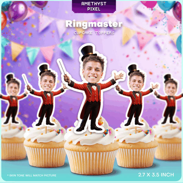 Step right up and make your child the star of the show with these personalized Ringmaster cupcake toppers. Designed specifically for a thrilling circus or carnival-themed birthday, this digital download features a classic red ringmaster tailcoat, a tall top hat, and performance accessories. We custom-edit your provided photo to place your child’s face seamlessly into the design, ensuring the skin tone matches the image you send. Since this is a print-at-home file, you avoid shipping times and have full control over the paper quality and quantity needed for your dessert table. These toppers are an excellent choice for toddlers and young children celebrating a 'Greatest Show' style event.