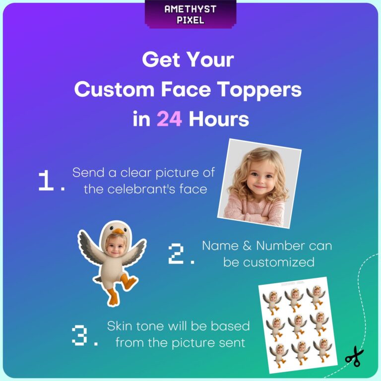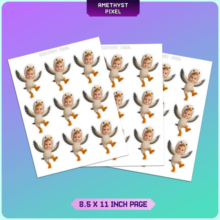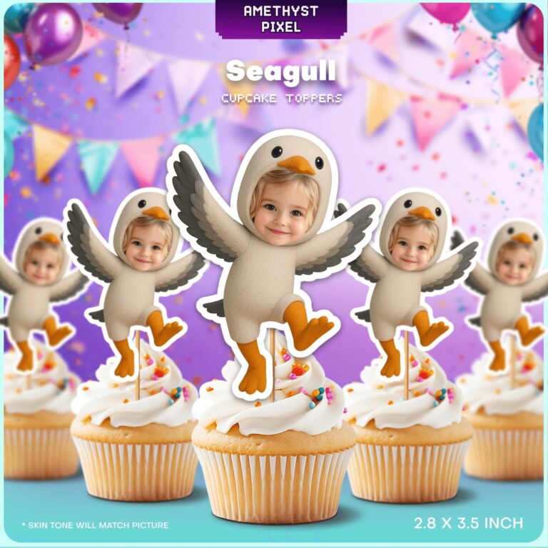 Bring the fun of the seaside to your dessert table with these hilarious custom seagull cupcake toppers that feature your child’s face inside a whimsical bird hood. Perfectly suited for toddlers and young children, each topper depicts a lively seagull character with outstretched grey wings and bright orange webbed feet, capturing the energetic spirit of coastal wildlife. These personalized decorations measure approximately 2.8 by 3.5 inches, making them the ideal size to stand out on standard cupcakes or muffins without tipping over. Whether you are planning a nautical event or a summer pool party, these expert-quality photo edits transform a simple photo into a memorable, laugh-out-loud party accessory that guests will adore.