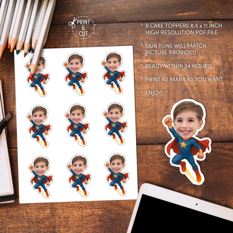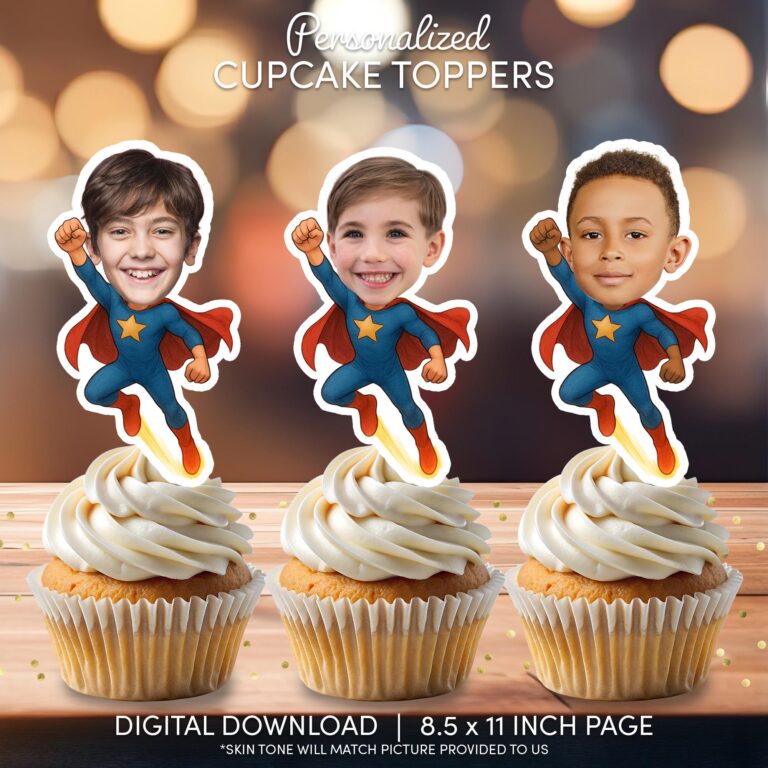 Transform your child into the ultimate crime-fighter with these personalized superhero cupcake toppers. Designed primarily for boys' birthday parties, this custom decor features a classic blue suit, red cape, and golden star emblem, capturing the excitement of a flying action hero. Upon purchase, your provided photo is expertly integrated onto the character body—with skin tones matched to the photo for a realistic finish. As a digital printable, this allows you to create as many toppers as you need right from home. For the sturdiest finish, I recommend printing on heavy cardstock; the white outline acts as a perfect cutting guide, making assembly quick for busy parents preparing for a super celebration.