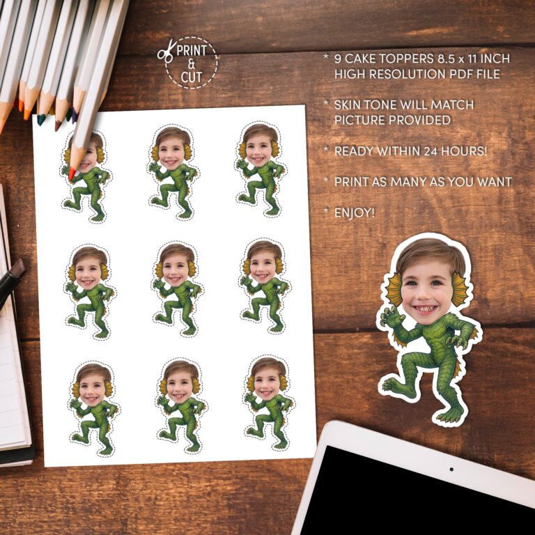Transform your birthday star into a classic lagoon creature with these hilarious personalized swamp monster cupcake toppers. Ideally suited for children celebrating a spooky birthday or a fun Halloween bash, this digital download features a detailed green, scaly body with fins and claws. You provide the photo, and we expertly crop the face to fit seamlessly onto the gill-man body, matching the skin tone where possible for a cohesive look. These printable decorations are a fantastic way to add humor and a personal touch to your dessert table. Once the file is ready, you can print from home, ensuring you have the perfect number of little monsters for your event without waiting for shipping.