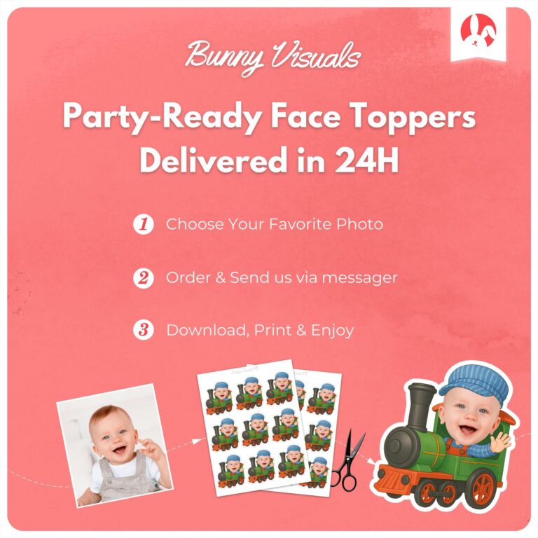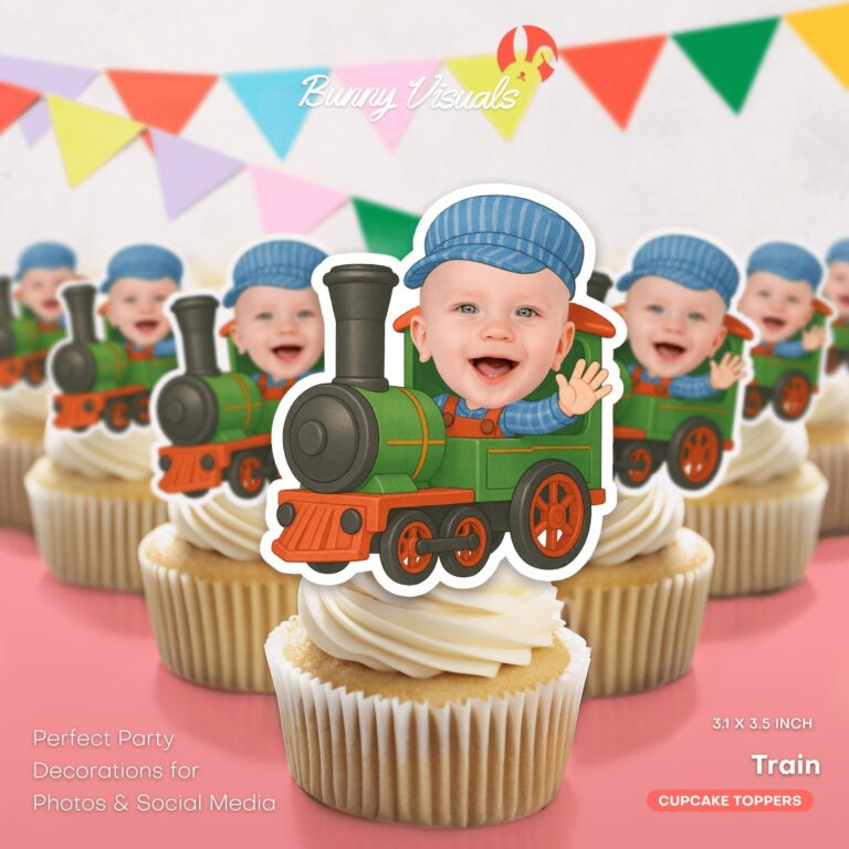 Transform your little one into the star engineer of their own railroad birthday with these expertly crafted custom train cupcake toppers. Featuring a classic green steam locomotive design with vibrant red wheels and a realistic smokestack, this decoration seamlessly integrates your baby’s photo wearing a traditional blue striped conductor’s hat. Perfect for "Choo Choo" themed celebrations or a vintage travel party, these toppers offer a high-quality, personalized element that elevates your dessert table visuals beyond generic store-bought supplies. Rather than settling for standard transport decor, these printable assets provide a unique, humorous, and heartwarming focal point suitable for toddlers and babies. The design is optimized for standard cupcakes, ensuring the vibrant colors pop in photos while remaining easy to cut and assemble at home.