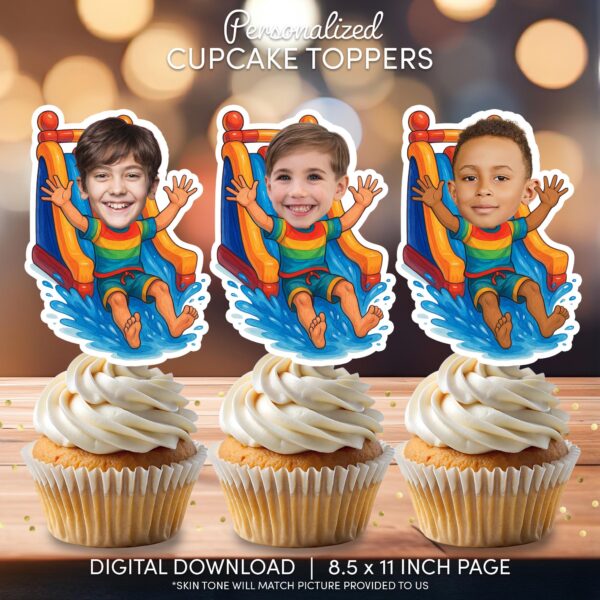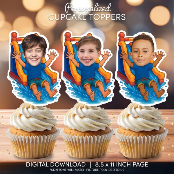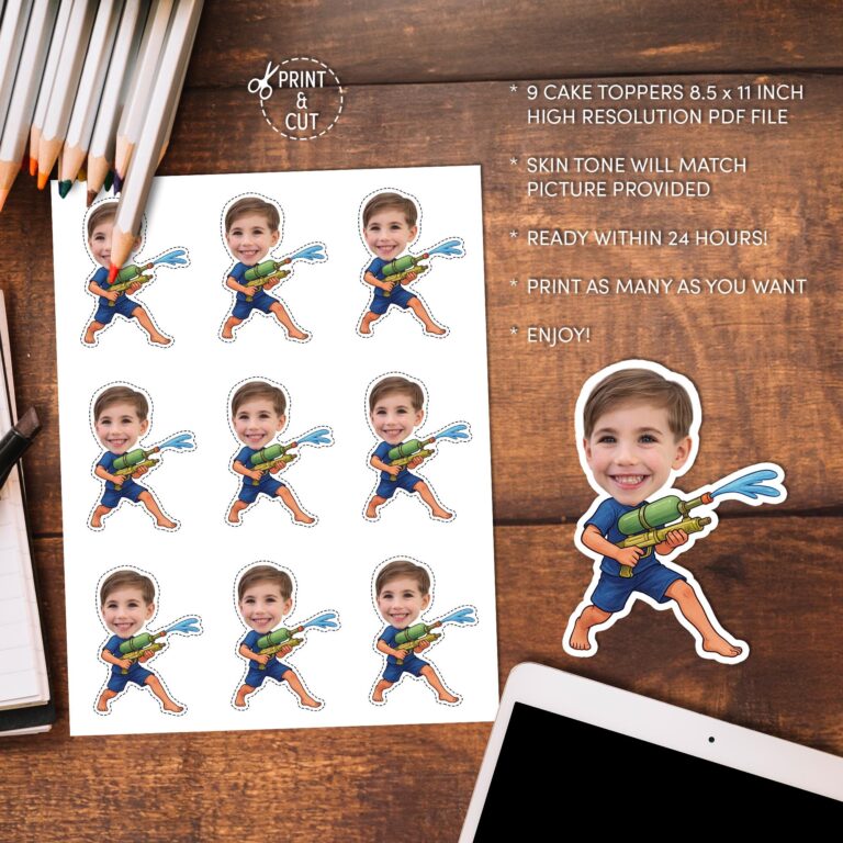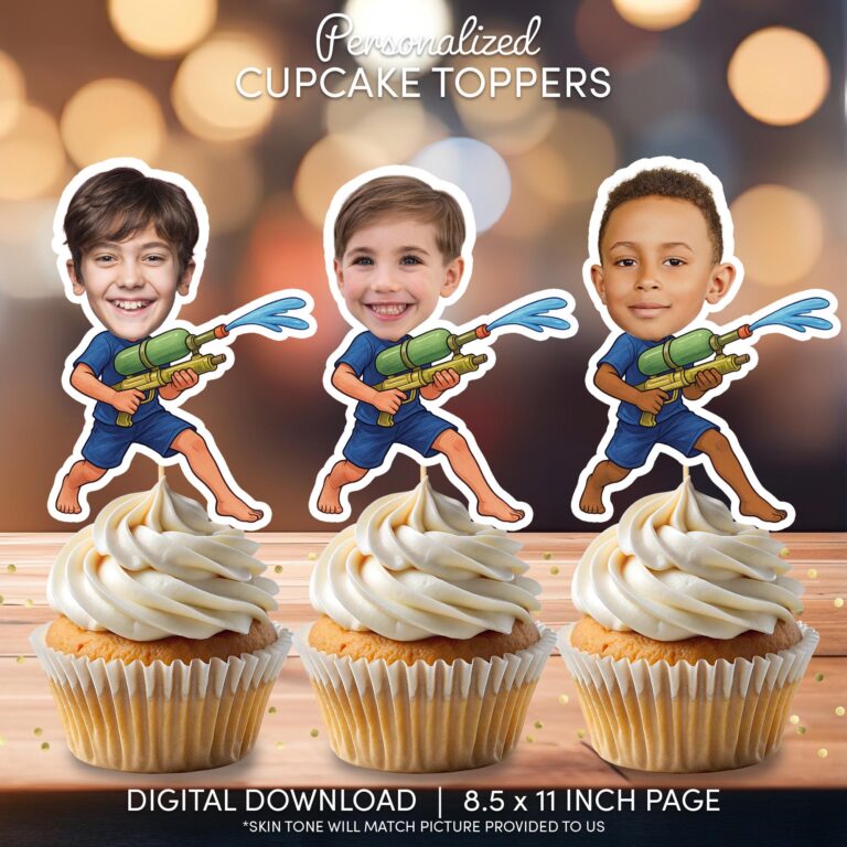 Make a splash at your next summer event by turning the guest of honor into the ultimate water warrior with these custom face cupcake toppers. Perfect for children's birthday parties or backyard gatherings, this digital design features a playful cartoon body equipped with blue shorts and a large green water blaster. We professionally crop your submitted photo and carefully adjust the skin tone of the character's body to match your picture, ensuring a seamless and personalized look. These printable decorations are an excellent way to add humor and excitement to a dessert table at a pool party or water fight celebration. Once you receive your file, simply print, cut, and assemble for an unforgettable party highlight.