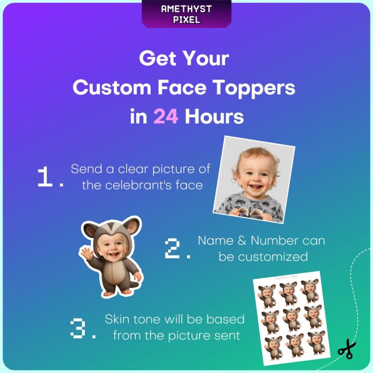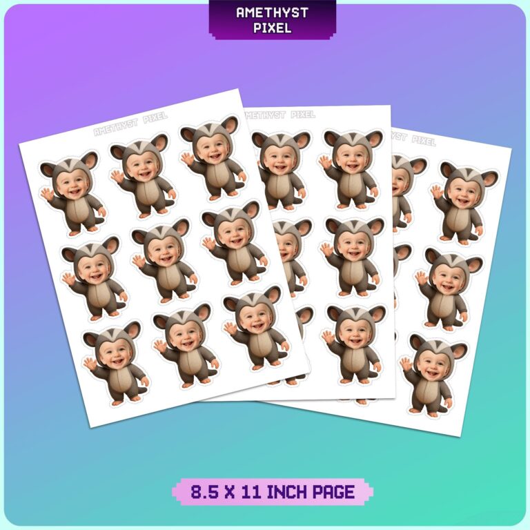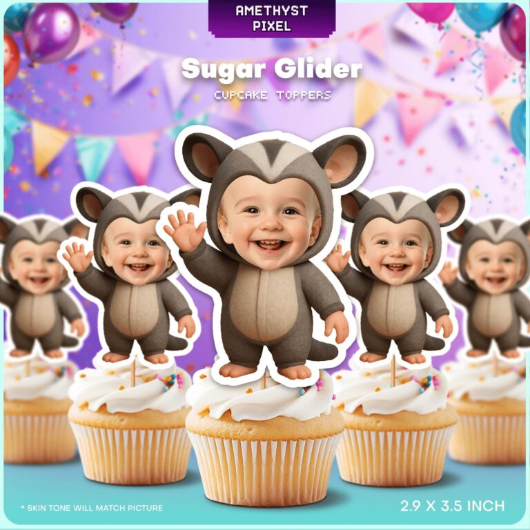 Transform your party treats into a delightful showcase of your little one with these charming sugar glider custom face cupcake toppers. Designed for families who appreciate unique exotic animals or Australian wildlife themes, this decoration features an adorable grey and white marsupial bodysuit with characteristic large ears and a striped forehead. By integrating your baby or toddler's smiling photo into this cozy creature costume, you add a personalized and heartwarming touch to the dessert table. These toppers are roughly 3.5 inches tall, making them the perfect size to stand out on frosted cupcakes or muffins without overwhelming the treat. Whether you are hosting a distinct 'Wild One' first birthday or an exotic pet-themed gathering, these photo-based picks ensure the birthday child remains the star of the celebration.