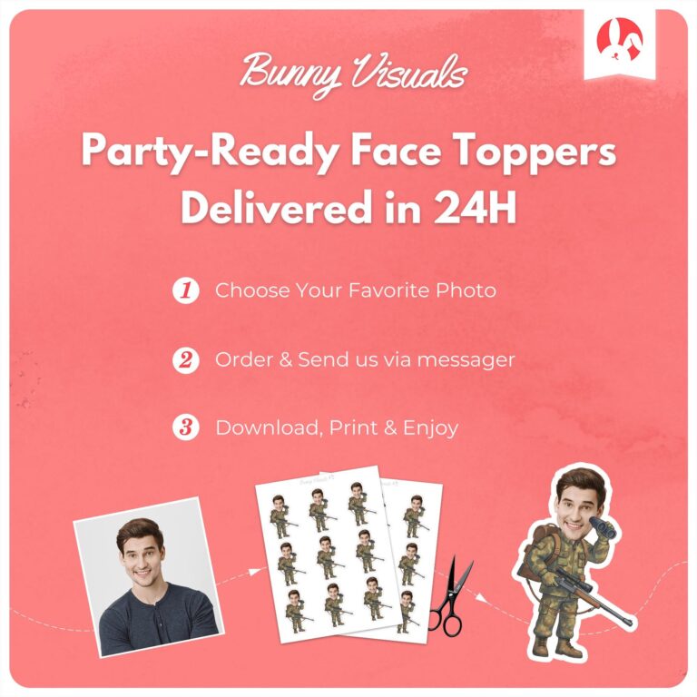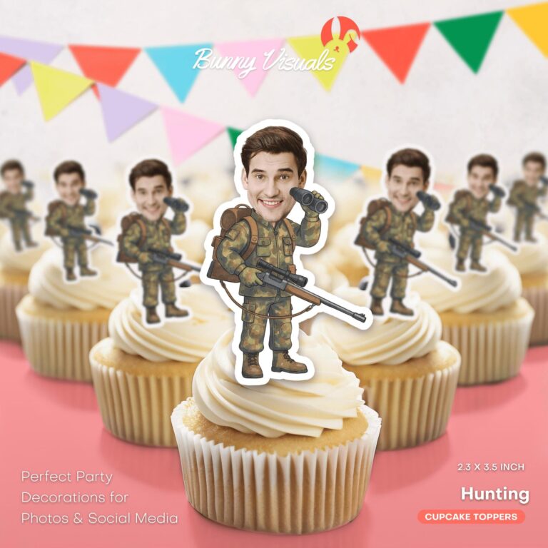 Gear up for an unforgettable celebration with these expertly designed hunting-themed cupcake toppers that transform your guest of honor into the ultimate outdoorsman. Featuring a highly detailed illustration of a hunter clad in full camouflage gear, carrying a rifle and holding binoculars, these party decorations capture the excitement of the hunt perfectly. This digital template allows you to seamlessly integrate a custom photo of a dad, husband, or friend, creating a hilarious and personalized centerpiece for any dessert table. Ideal for adult birthdays, bachelor parties, or deer camp kick-offs, these printable toppers offer a high-quality, professional aesthetic that is easy to assemble at home. Whether you are celebrating a milestone 40th birthday or a retirement, these rugged, custom face accents ensure the party theme hits the mark every time.