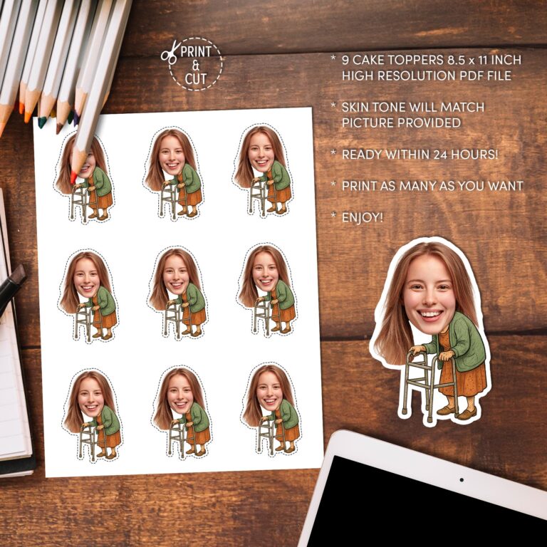 bring a dose of humor to your next celebration with these personalized cupcake toppers, featuring a comical "little old lady" body leaning on a walker. Perfect for retirement send-offs, "over the hill" birthdays (like a 40th, 50th, or 60th), or a fun tribute to a beloved grandmother, this digital download transforms your guest of honor into a charming senior character wearing a green cardigan. The design process includes matching the illustrated skin tone to the photo provided, ensuring a cohesive look. Once downloaded, you can print these festive decorations at home to create an unforgettable, laughter-filled dessert display that celebrates aging with style and wit.
