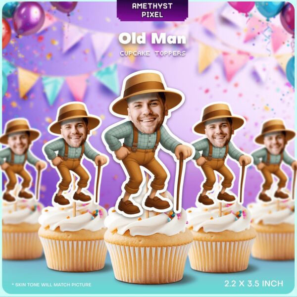 Inject genuine humor into your next milestone celebration with these hilarious custom face cupcake toppers, designed specifically for ‘Over the Hill’ parties or lighthearted retirement bashes. Based on our extensive experience with adult birthday planning, nothing breaks the ice quite like seeing the guest of honor’s face superimposed onto a comedic, hunched-over elderly character. This detailed design features a classic grandpa aesthetic, complete with high-waisted trousers, suspenders, a plaid shirt, and a walking cane, capturing the quintessential 'aging' look. Ideal for 30th, 40th, or 50th birthday parties, these printable decorations provide a high-quality visual gag that resonates with guests. We expertly match the skin tone from your provided photo to ensure a seamless, professional finish. Delivered as a digital file, these toppers measure approximately 2 x 3.3 inches, making them perfectly sized for standard cupcakes and easy to print at home on 8.5 x 11 inch cardstock.