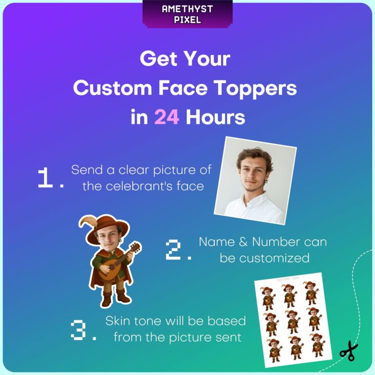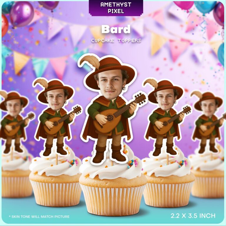 Elevate your next tabletop campaign or medieval celebration with these charismatic Bard cupcake toppers, explicitly designed for role-playing game enthusiasts and fantasy lovers. Each topper showcases the guest of honor's photo seamlessly blended onto a classic wandering minstrel body, featuring a signature feathered wide-brimmed hat, a strapped wooden lute, and authentic adventurer's attire including a green tunic and sturdy boots. These custom face decorations function as an excellent conversation starter for adult gaming groups or teen birthday parties centered around dungeons and dragons style adventures. Measuring approximately 2.2 by 3.5 inches, these printable accents provide a high-quality, professional look that celebrates the 'face' of your party as the ultimate storyteller and musician of the group.