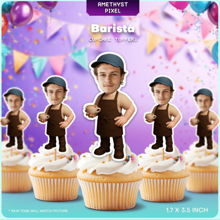 Elevate your next event with these expertly designed Barista custom face cupcake toppers, tailored specifically for coffee enthusiasts and professional café environments. This printable decoration captures the authentic look of a skilled barista, featuring a detailed dark brown apron, a casual service cap, and a cup of fresh latte art held confidently in hand. Ideal for adult birthdays, workplace milestones, or brunch gatherings, these toppers allow you to seamlessly integrate a photo of your friend or coworker for a humorous and personalized touch. Whether you are celebrating a promotion at a local coffee shop or hosting a 'Thanks a Latte' appreciation party, these high-resolution cutouts demonstrate a commitment to quality and theme consistency.