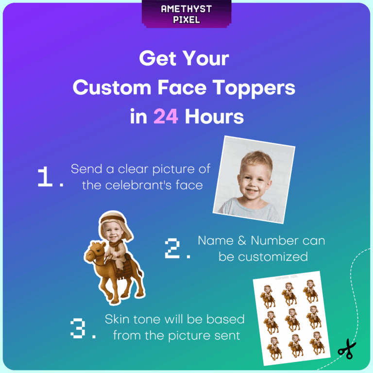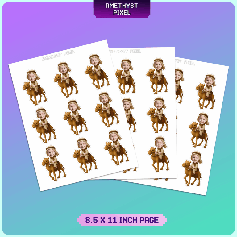 Transport your party guests to a fun-filled desert adventure with these custom camel rider cupcake toppers. Designed primarily for toddlers and young children, this personalized decoration features your child’s face professionally edited onto an adorable character riding a friendly camel. Whether you are hosting an Arabian Nights-inspired celebration, a wild desert bash, or a unique animal-themed birthday, these toppers add a hilarious and heartwarming focal point to your dessert table. As a digital download, you receive a high-resolution file that allows you to print as many copies as you need, ensuring every cupcake features the birthday star’s smiling face. The design uses warm, earthy tones that look fantastic when printed on quality paper.