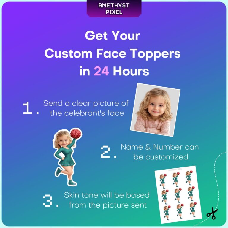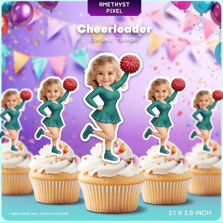 Elevate the spirit of your upcoming celebration with these expertly crafted custom face cupcake toppers, featuring a lively cheerleader design perfect for toddlers and young children. Clad in a stylish teal uniform with matching high-top sneakers and brandishing a maroon pom-pom, this cartoon body serves as the ideal template for your little one's photo. The dynamic high-kick pose brings a genuine sense of action and joy to the dessert table, making them an excellent choice for sports-themed birthday parties or cheer squad milestones. As experienced party planners know, personalized details are what make an event truly memorable; these printable decorations offer a seamless blend of professional design quality and DIY convenience, ensuring your treats look polished, festive, and completely unique to the birthday girl.