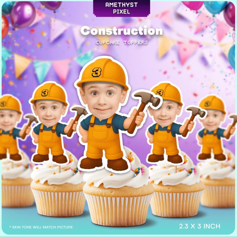 Transform your little one into the foreman of their own celebration with these expertly crafted construction-themed cupcake toppers. Designed specifically for toddlers and young children, each topper features a charming cartoon body wearing bright orange overalls, sturdy work boots, and a classic yellow hard hat—perfect for a "work zone" or "dig it" birthday theme. The character is depicted holding a hammer, adding a playful and active element to your dessert table. By adding your child's custom photo, you create a humorous and heartwarming centerpiece that instantly personalizes the event. Whether you are celebrating a milestone 3rd birthday or a general truck-themed bash, these high-quality decorations ensure your cupcakes stand out as the highlight of the construction site.
