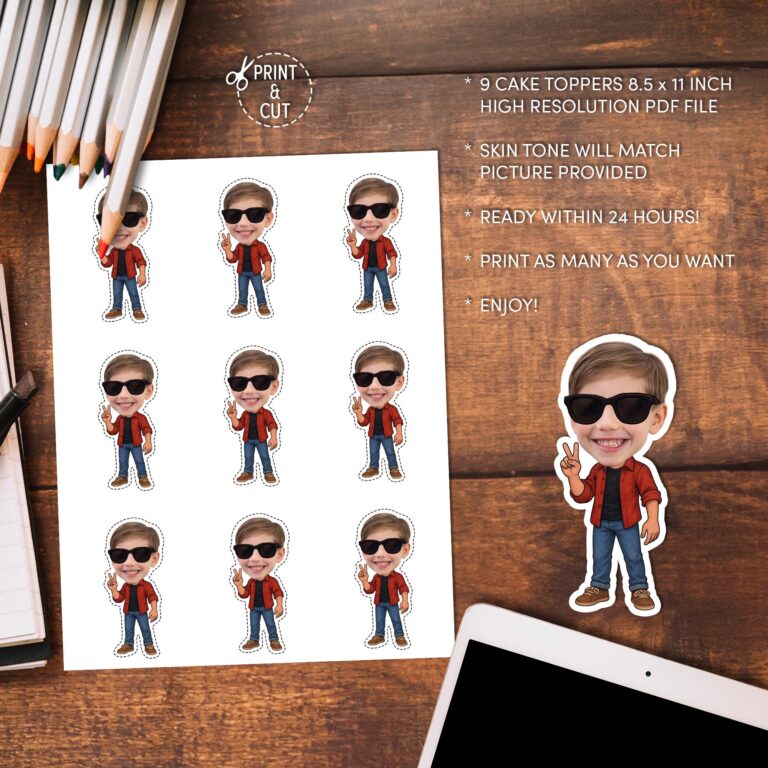 Transform your birthday celebration into a stylish event with these custom face cupcake toppers featuring a "cool kid" theme. This digital design showcases a cartoon body dressed in a red button-up shirt, jeans, and casual sneakers, striking a peace sign pose with digital sunglasses added over the photo face. Ideal for boys' birthdays or casual celebrations, the design seamlessly integrates your provided photo to create a fun, personalized centerpiece for your dessert table. Because this is a print-at-home digital file, you have the flexibility to print as many copies as you need on your preferred paper stock. Please ensure the photo you provide interacts well with the sunglasses overlay for the best visual impact.