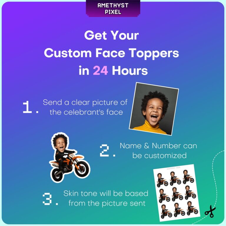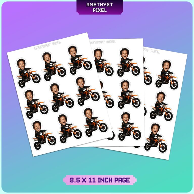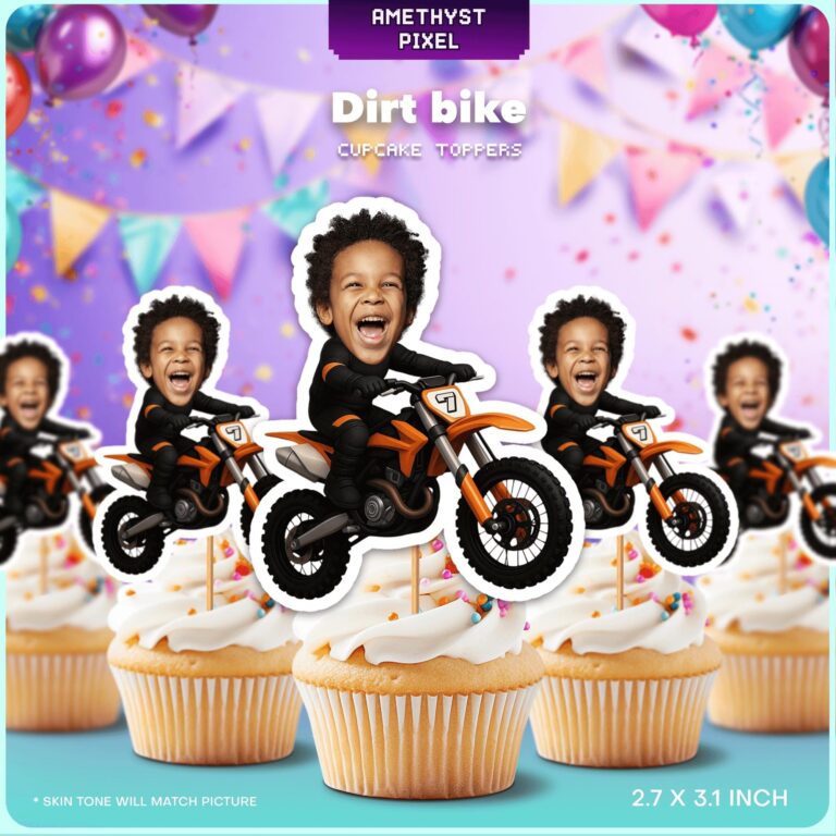 Kickstart the celebration with our high-energy custom face dirt bike cupcake toppers, the ultimate addition to any motocross birthday bash. This fearless design showcases a rider clad in a sleek black racing suit, maneuvering a powerful orange dirt bike with style. We expertly crop your child’s smiling face onto the body, transforming them into the star athlete of their own extreme sports party. Ideal for toddlers and young boys who crave adrenaline, these personalized decorations bring laughter and excitement to your dessert spread. Whether you are topping frosted cupcakes or adding flair to a 'mud-pie' brownie tray, these printable accents ensure your event finishes in first place. Experience the thrill of custom party decor that captures the true spirit of off-road racing.