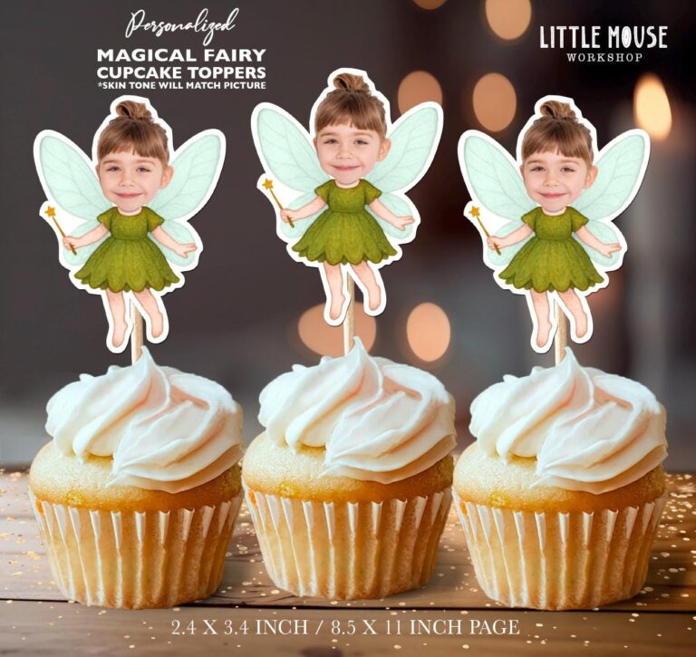 Bring a touch of whimsy to your child's celebration with these professionally designed green fairy cupcake toppers. Specifically crafted for toddlers and young girls, themes featuring enchanted forests or magical sprites come to life when the guest of honor’s smiling face is superimposed onto a delicate fairy body. The design showcases a textured green petal dress, ethereal wings, and a sparkling golden wand, perfect for a garden-themed event or a classic fairytale birthday. As experienced party planners know, personalized touches like these high-quality photo cutouts elevate a dessert table from standard to spectacular. This printable decor ensures you get a sharp, vibrant result that captures the magic of childhood imagination.