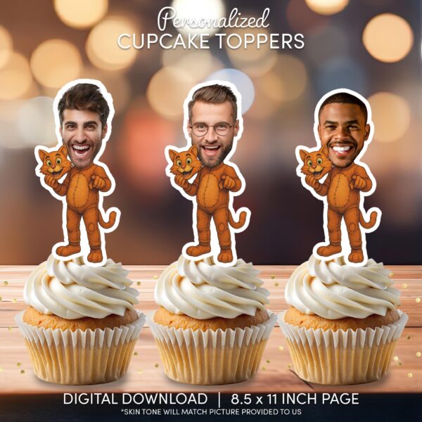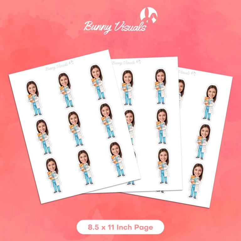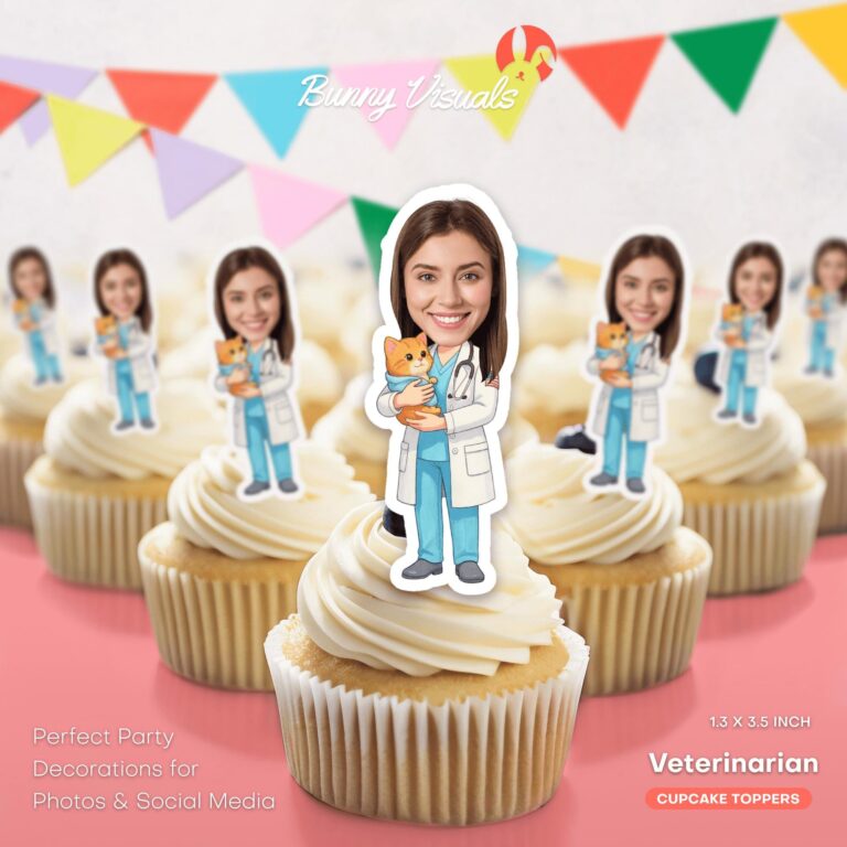 Celebrate the dedicated animal doctor in your life with these professionally designed veterinarian cupcake toppers features a custom photo of the guest of honor. Ideal for veterinary school graduations, white coat ceremonies, or clinic celebrations, each cutout transforms a personal headshot into a charming cartoon vet dressed in blue surgical scrubs and a white lab coat, affectionately holding an orange tabby cat. These high-quality, printable decorations serve as the perfect tribute to specific career milestones, offering a humorous yet heartwarming addition to your dessert table. Whether you are honoring a newly qualified DVM or a hard-working vet tech, these personalized cake picks provide a unique focal point for photos and social media sharing.