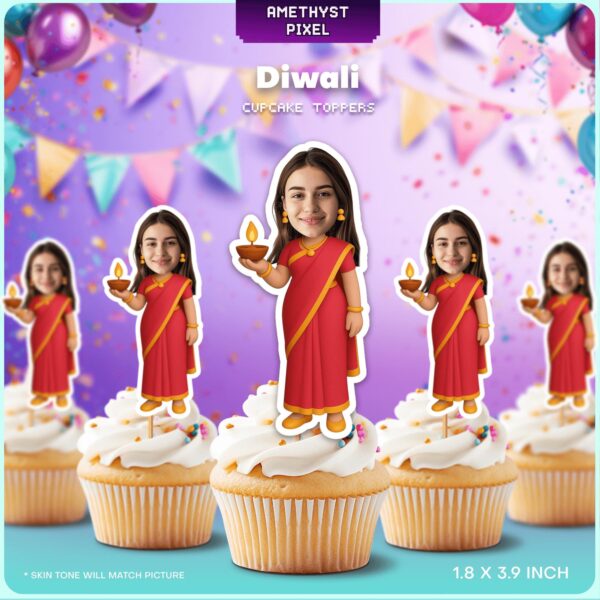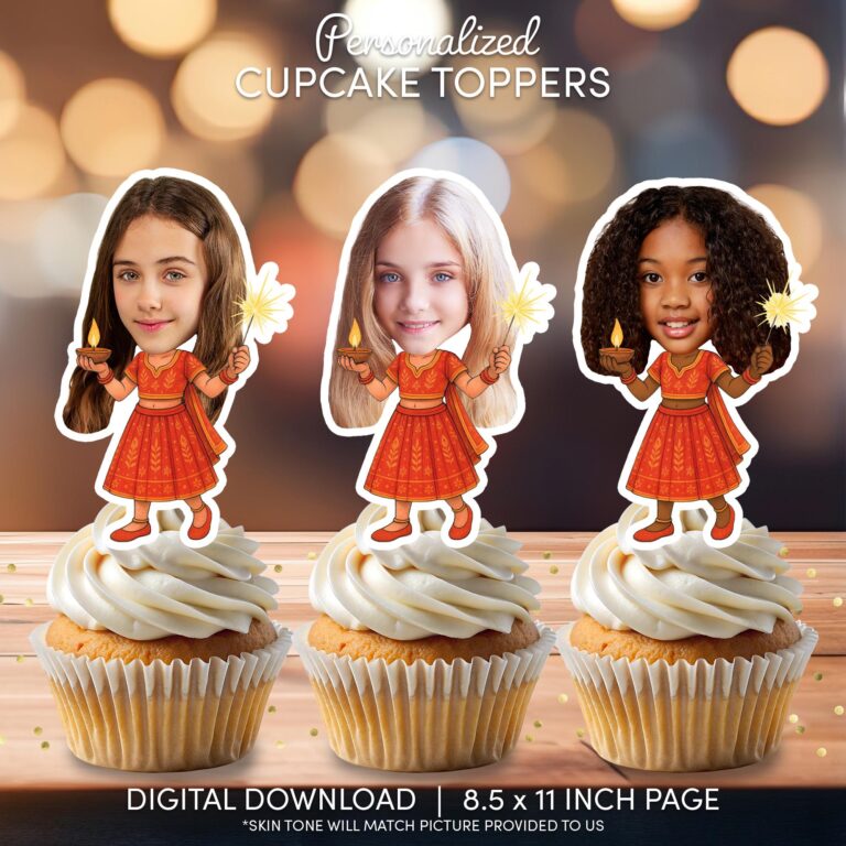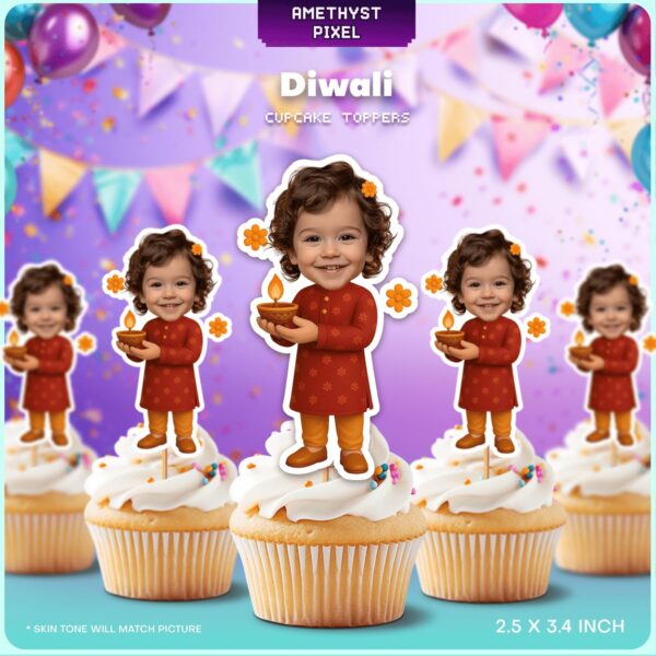 Elevate your Festival of Lights celebration with these charming, custom face Diwali cupcake toppers. Designed to delight children and families alike, this digital download transforms your loved one into a festive character wearing a beautiful traditional orange lehenga, holding a lit Diya lamp and a glowing sparkler. Ideal for adding a unique, personalized element to your holiday sweets, the design creates a fun photo-to-cartoon effect by placing your provided picture onto the illustrated body. The design process includes adjusting the character's skin tone to blend naturally with the photo you submit for a professional finish. Simply download the high-resolution file, print at home on sturdy paper, and cut them out for an unforgettable addition to your Diwali party spread.