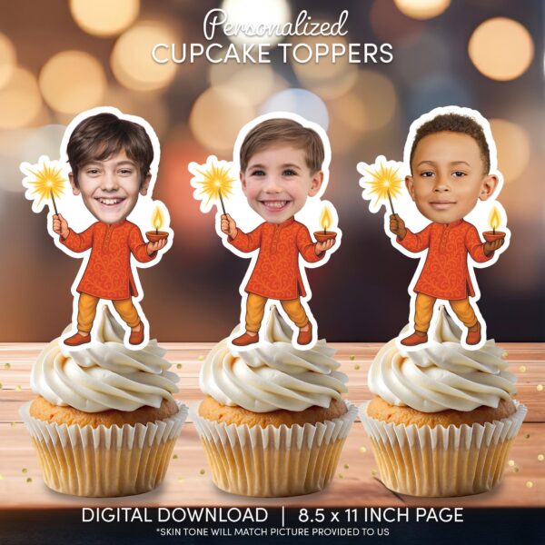 Personalized Diwali Cupcake Toppers Custom Face Photo - Indian Festival of Lights Printable Party Decor with Diya & Sparkler