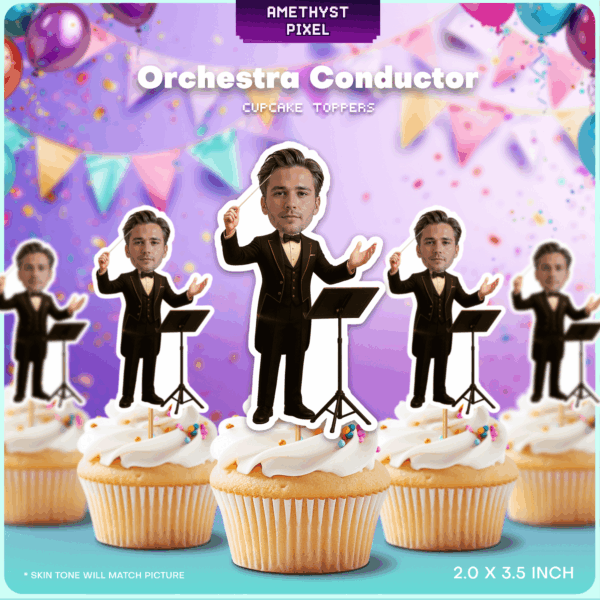 Personalized Orchestra Conductor Face Cupcake Toppers - Maestro Music Party Decor