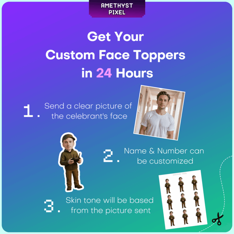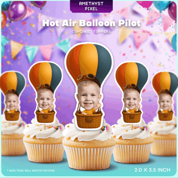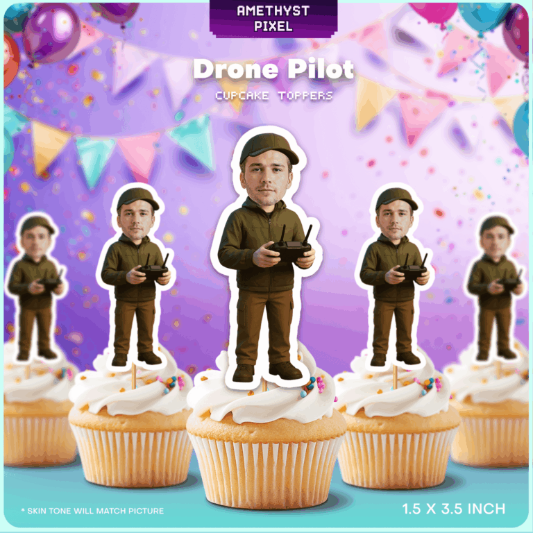 Take your celebration to new heights with these custom face drone pilot cupcake toppers, designed specifically for aviation enthusiasts and RC hobbyists. Perfect for older children, teens, and adults who love quadcopters or aerial photography, these printable decorations transform the guest of honor into a pro pilot geared up with a remote control transmitter. The design features a realistic outdoor outfit, making it an excellent choice for tech-themed birthdays or drone racing watch parties. As a high-resolution digital download, this product allows you to print as many copies as needed from home or a local print shop. The sharp details ensure the pilot's body and controller look crisp, adding a fun, personalized focal point to your dessert table.