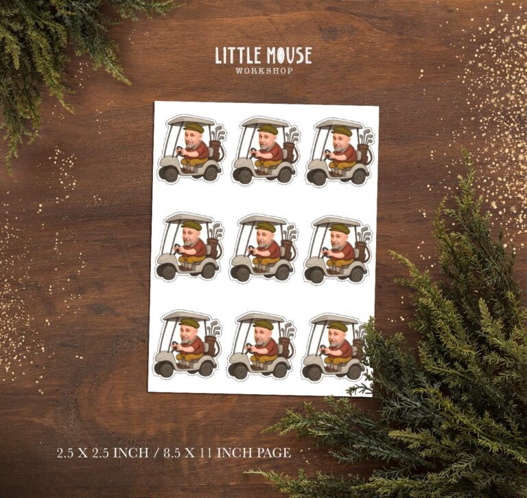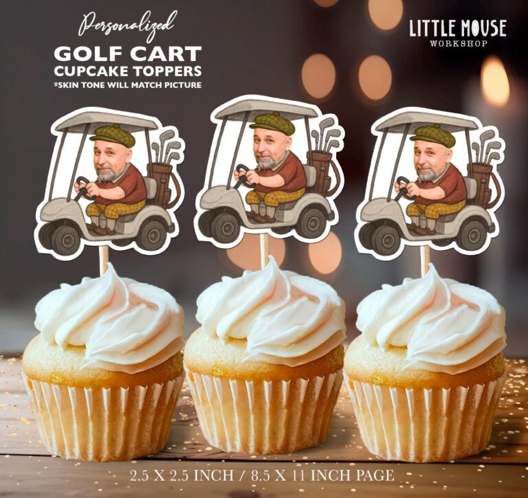 Elevate your fairway festivities with these amusing custom face golf cart cupcake toppers, designed specifically for the dedicated golfer in your life. Whether you are planning a relaxed retirement celebration for a colleague or a milestone birthday for Dad or Grandpa, these digital printables bring humor and personality to the dessert table. The detailed illustration features a classic golfer driving a cart, fully decked out in traditional plaid knickers, a burgundy polo, and a flat cap, with a full set of clubs ready for the next hole. Upon purchase, we seamlessly blend your uploaded photo onto the character, ensuring the skin tone matches perfectly for a professional look. Provided as a high-resolution, ready-to-print PDF, these 2.5-inch toppers are simple to assemble at home, offering an easy yet unforgettable way to score a hole-in-one with your party decor.