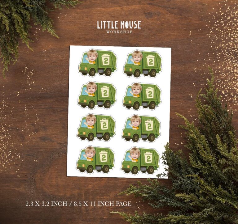Transform your toddler’s 'Trash Bash' into a memorable event with these custom garbage truck cupcake toppers, featuring your child’s smiling face right in the driver’s seat. Perfect for a second birthday celebration, the design highlights a classic green sanitation vehicle with a prominent '2' on the side, capturing the excitement little ones feel when the weekly trash collector arrives. As experts in personalized party printable designs, we ensure these files are optimized for distinct, vibrant printing on standard 8.5 x 11-inch cardstock, yielding precise 2.3 x 3.2-inch cutouts. This custom decor brings a high level of polish to your dessert table, proving that even a heavy machinery theme can be adorable and photogenic. Simply print, cut, and attach to picks to delight your guests with a uniquely personal touch that celebrates your child’s favorite big rig.