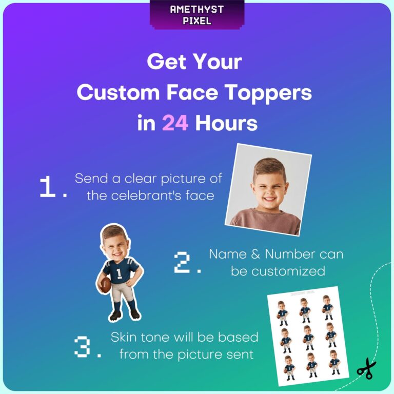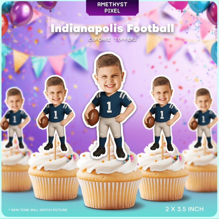 Score a touchdown at your next celebration with these expertly crafted Indianapolis football cupcake toppers, designed to feature a custom photo of your child's face on a dynamic player body. Ideally suited for young sports fans and school-aged children, each topper depicts a little athlete wearing a professional-style blue jersey with the number one, grey football pants, and cleats while clutching a brown football. These high-resolution printable decorations measure 2 x 3.5 inches, making them the perfect size to stand out on standard bakery treats or homemade cupcakes. Whether you are planning an Indianapolis-themed birthday bash or a lively game day viewing party, these personalized photo accents add a layer of excitement and customization that generic decorations simply cannot match. Our design process ensures the skin tone matches your provided picture for a seamless, high-quality finish.