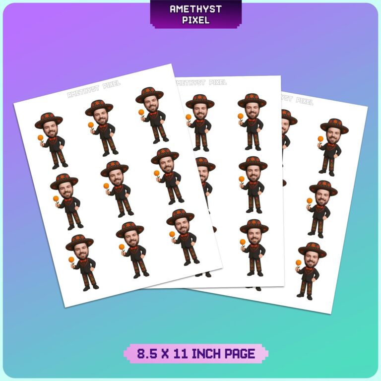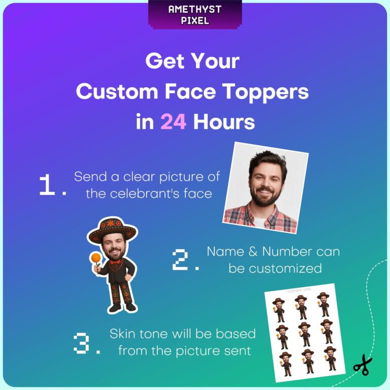 Transform your Mexican-themed event with these highly detailed custom face cupcake toppers, featuring a traditional mariachi charro suit adorned with vibrant floral embroidery. Designed specifically for Day of the Dead (Día de los Muertos) festivities or adult birthday fiestas, this digital design depicts a male figure holding a symbolic orange marigold (cempasúchil) and wearing a matching embroidered sombrero. The personalization process ensures the skin tone of the character body is adjusted to compliment your uploaded photo, providing a seamless and professional finish. These printable cake picks offer an authentic touch to your dessert display, making them an excellent choice for celebrating culture and life with humor and style. Delivered as a high-quality digital file, they are optimized for easy home printing and assembly to suit standard sized cupcakes.