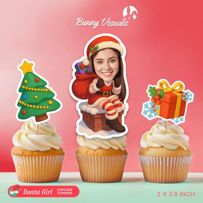 Elevate your festive dessert display with these thoroughly charming custom Christmas cupcake toppers, designed to feature the photo face of your choice on a playful Mrs. Claus or Santa Girl character. Expertly crafted for holiday gatherings, this design showcases a figure dressed in a traditional red velvet-style suit with striped stockings, sitting comfortably atop a brick chimney while clutching a sack full of gifts. The set is complemented by thematic accessory toppers, including a decorated spruce tree and a wrapped present box, ensuring a varied and dynamic look for your treats. Ideal for adult holiday parties, office celebrations, or family dinners, these personalized decorations add a humorous and heartwarming touch to professionally baked or homemade cupcakes, serving as an instant icebreaker and photo opportunity for guests.