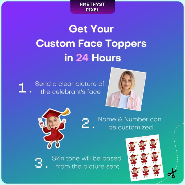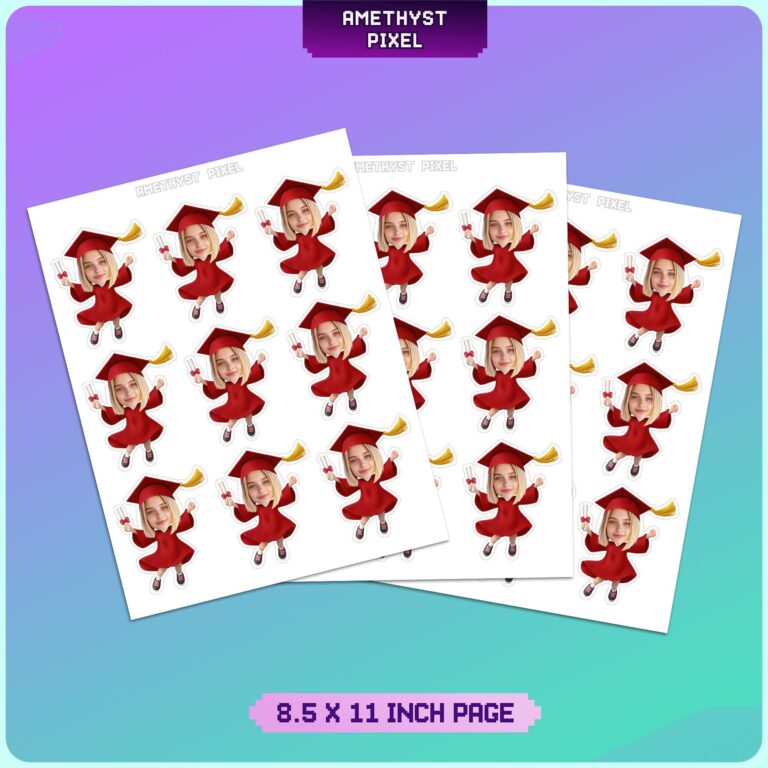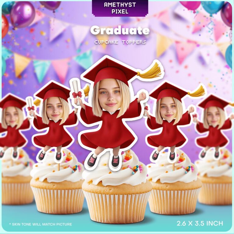 Celebrate your student's academic milestone with these high-energy custom face graduation cupcake toppers featuring a cheerful graduate in a classic red gown. Each topper depicts a jumping cartoon figure wearing a traditional mortarboard cap with a gold tassel, clutching a rolled diploma to symbolize their hard work. Designed for graduates of all agesâfrom kindergarten moving-up ceremonies to high school commencementsâthese decorations add a personalized touch that standard party supplies cannot match. We ensure the cartoon body's skin tone complements your uploaded photo for a seamless, professional appearance. Measuring approximately 2.6 x 3.5 inches, these printable accents are the perfect height for standard cupcakes, muffins, or savory party appetizers, serving as an unforgettable focal point for your graduation dessert spread.