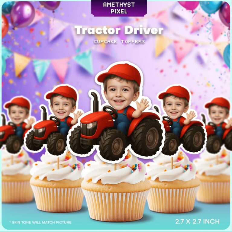 Personalized Face Red Tractor Driver Cupcake Toppers for Farm Themed Birthdays